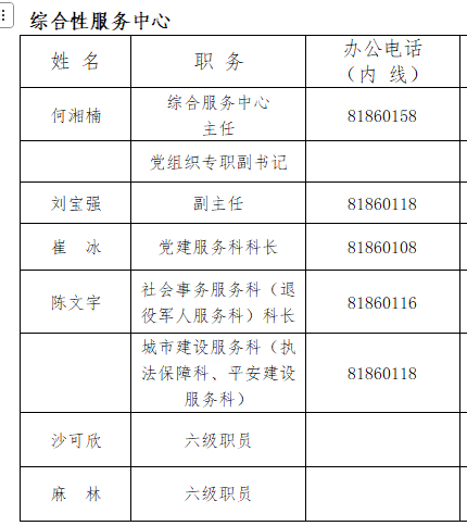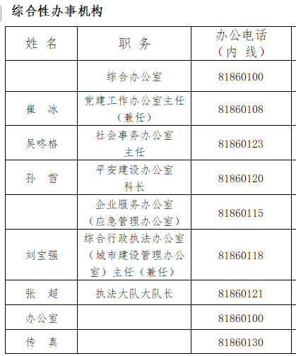 综合办公室、党建工作办公室、社会事务办公室、平安建设办公室、企业服务办公室(应急管理办公室)、综合行政执法办公室(城市建设管理办公室)。