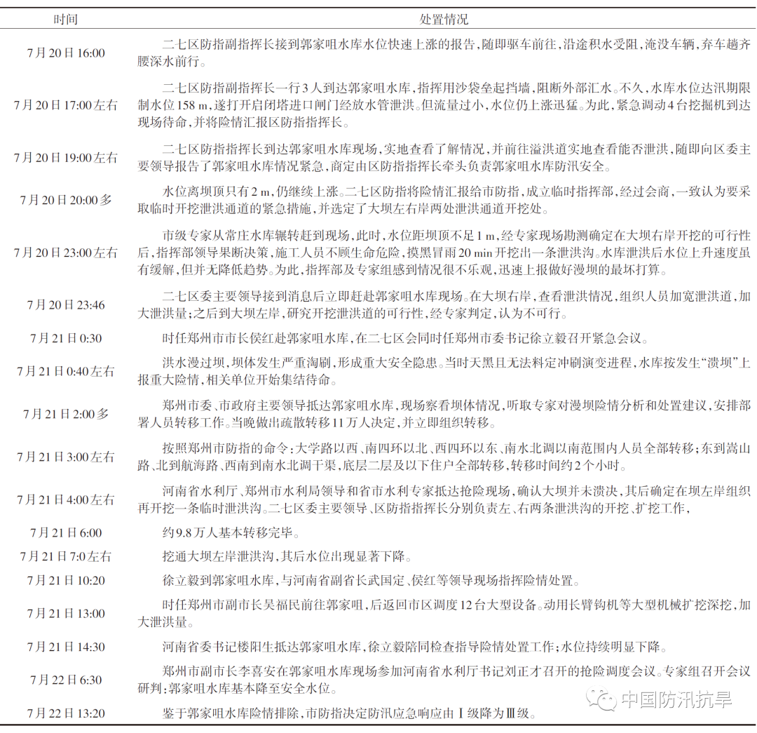 郭家咀水库位于郑州市二七区南部浅山丘陵区,为金水河上游一座以防洪为主、兼顾生态及涵养地下水等综合利用的小(1)型水库,集雨面积仅有13.15平方千米。坝体为土坝,坝顶高程163.5米;原设计总库容487.6万立方米,由于常年淤积挤占,实测库容尚存222.3万立方米。水库下游的金水河流经郑州市主城区后经东风渠汇入贾鲁河(图1)。水库有一放水闸门,但流量很小,仅0.4~5立方米每秒。水库大坝左侧的张李垌沟原为金水河上游左岸一条自然冲沟,建库时经疏挖和护坡,被改造为水库的溢洪道。2010年郭家咀水库完成了除险加固项目,并通过验收。 2018年9月,河南五建建设集团有限公司(以下简称五建)施工建设郑州市南四环路跨张李垌沟(郭家咀水库溢洪道)高架桥时,在溢洪道内修筑施工便道,并在上游侧采用混凝土进行护坡,严重影响水库泄洪安全。 郭家咀水库工作人员巡查时发现这一情况,要求其拆除,并多次到现场督导督办无果,即将此情况上报了郑州市河长办。五建以施工所需为由,仅出具了纸质承诺,施工完成后即拆除。其间,二七区农委及金水源街道工作人员多次要求施工单位提供南四环桥过金水河张李垌段(溢洪道)防洪影响处理评价及审批材料,而施工方在多次催促下仅提供了南四环桥过金水河郭家咀段防洪影响评价的相关材料。2020年12月,五建再次出具纸质承诺,2021年汛前将拆除施工便道,不影响溢洪道泄洪。但是,原预期2021年5月底具备通车条件的南四环路完工日期一拖再拖。2021年二七区汛前检查,发现溢洪道仍然被堵,且四环高架桥下前后约100米范围内堆放了很多施工弃土弃渣,当即要求五建立即恢复原状。然而,五建以四环高架桥为市重点项目不归区政府管为由,既未清理,也未制定必要的度汛方案和应急预案,未落实安全度汛措施。其后水库三个责任人多次要求其疏通溢洪道均被拒。 直至7月中旬郑州市气象部门预报特大暴雨来临,连发多道橙色、红色预警,施工方也未采取相应有效的应急处置措施,导致7月20日下午超记录特大暴雨降临时,郭家咀水库因溢洪道被堵而无法正常泄洪,出现了水库漫顶的重大恶性事件。
