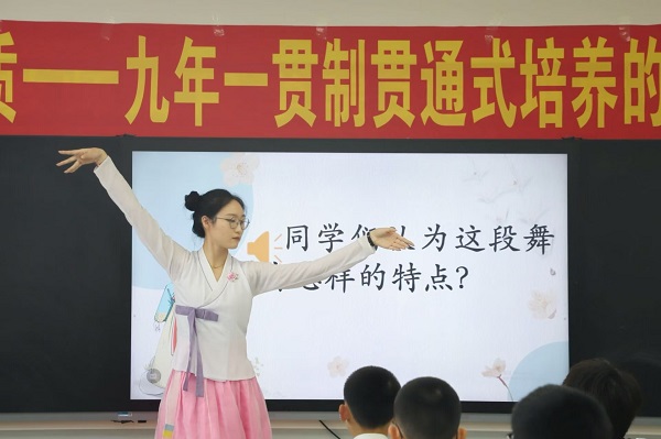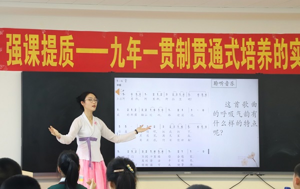 《阿里郎》是一首经典的朝鲜族民歌。音乐学科廖佳石老师以朝鲜族音乐的呼吸气韵贯穿始终,聚焦朝鲜族音乐的独特之处,引导学生学唱。在这一过程中,学生不仅掌握了歌唱技能,更增加了对多元民族文化的认识和理解。这一节课,不仅传授了专业的音乐知识,更增强了学生的民族团结意识。
