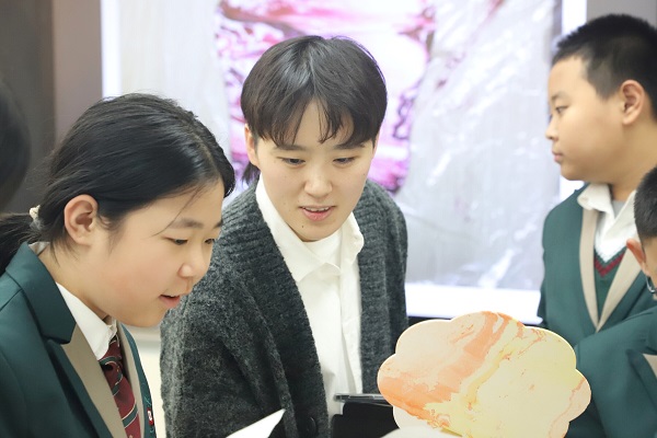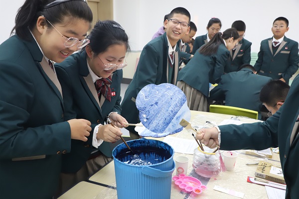 尹颢瑾老师以流行乐《青花瓷》开场,让同学们在哼唱之中开启探寻中国色的诗意之旅。尹老师借助古代文物图片与历史故事,引领学生寻找各类中国色,并深化同学们对传统文化的理解。课程共设置两个实践环节,运用传统方法制作蔬果汁染色书签和水拓印的方式把中国传统色应用在生活物品上。本节课融入语文、历史等学科知识,不仅加深学生对中国传统色彩的理解,还创作出既富有传统韵味又具有现代设计感的作品。